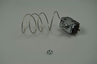 Denna termostat är för kylskåpet. Reglering av kyltermostaten gör att man bibehåller den önskade temperaturen i kylskåpet - ju högre det skruvas upp för termostaten, ju kallare bliver det i kylskåpet.